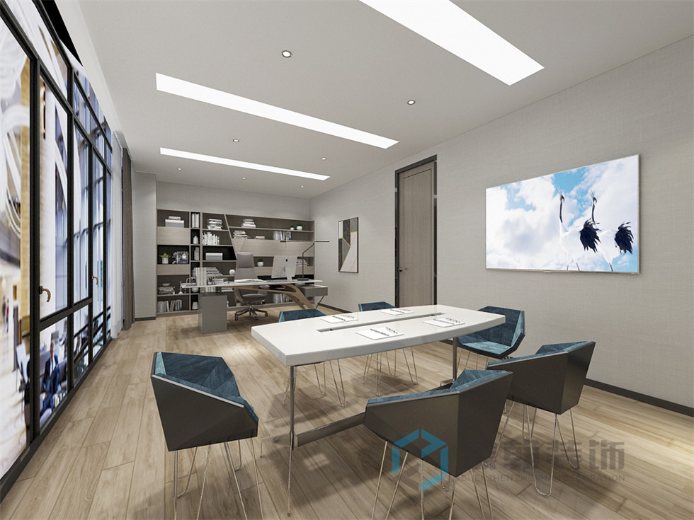 办公桌、会议桌使用大理石桌面,石面纹理波纹的流畅很好的中和了室内框架直线线条的硬朗,
